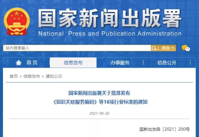 國家新聞出版署關(guān)于批準發(fā)布《知識關(guān)聯(lián)服務(wù)編碼》等16項行業(yè)標準的通知