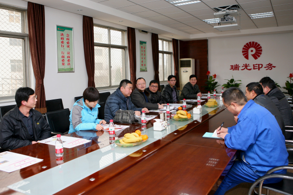圖為瑞光印務(wù)總經(jīng)理王在東及公司有關(guān)人員與考察領(lǐng)導(dǎo)交流: