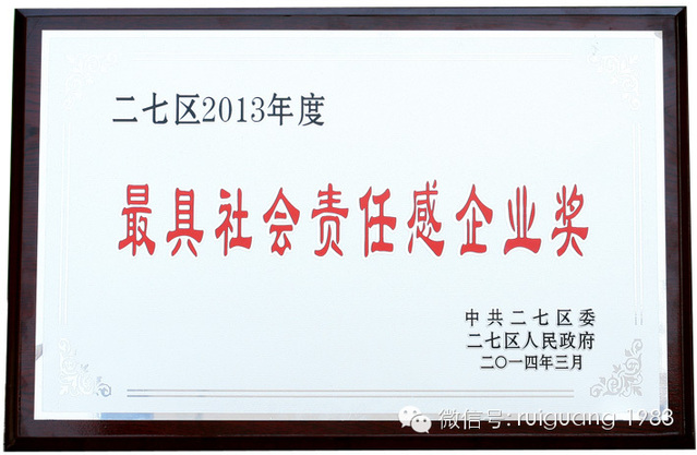 河南省瑞光印務股份有限公司被中共二七區(qū)委、二七區(qū)人民政府評為二七區(qū)2013年度最具社會責任感企業(yè)獎。