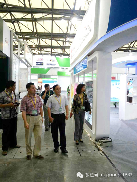 瑞光公司董事長向河南省新聞出版廣電總局副局長來有功、印刷處副處長袁松介紹我公司并引領(lǐng)領(lǐng)導(dǎo)參觀公司展區(qū)