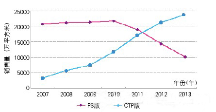 盡管CTP版的生產(chǎn)量與銷售量一直在增長,但CTP版的銷售額卻增長乏力。據(jù)統(tǒng)計,2013年CTP版銷售額為55.44億元人民幣,比2012年只增長了1%,但2013年CTP版銷售量卻同比增長了13%。2013年P(guān)S版銷售量同比下降31%,但PS版銷售額為18.31億元人民幣,同比下降了42%。這也說明,單位面積CTP版和PS版的銷售價格持續(xù)下降,單位面積CTP版的銷售價格下降速度明顯要超過單位面積PS版的銷售價格,隨著規(guī)模效應(yīng)和更多供應(yīng)商的加入,CTP版的成本優(yōu)勢進(jìn)一步顯現(xiàn)。