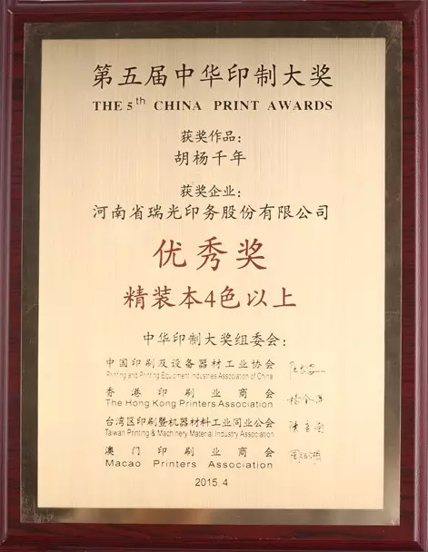2015年4月7日,河南省瑞光印務(wù)股份有限公司選送的印品《河洛四家》獲得銅獎;《胡楊千年》獲得優(yōu)秀獎。