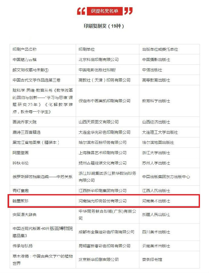 根據(jù)《中國出版政府獎?wù)鲁獭返囊?guī)定,國家新聞出版廣電總局開展了第四屆中國出版政府獎的評選表彰工作。經(jīng)過認(rèn)真評選,《習(xí)近平總書記系列重要講話讀本(2016年版)》等57種圖書獲圖書獎,《中國社會科學(xué)》等20種期刊獲期刊獎,《勝利日——大閱兵2015》等19種作品獲音像電子網(wǎng)絡(luò)出版物獎,《魯迅全集(1—18卷)》等10種作品獲印刷復(fù)制獎,《囊括萬殊 裁成一相:中國漢字“六體書”藝術(shù)》等10種作品獲裝幀設(shè)計獎;50家單位獲先進出版單位獎與67名個人獲優(yōu)秀出版人物獎。此外,還評出了234種優(yōu)秀出版物獲提名獎。其中由河南省瑞光印務(wù)股份有限公司承印河南美術(shù)出版社出版的《翰墨聚珍》獲印刷復(fù)制品提名獎。