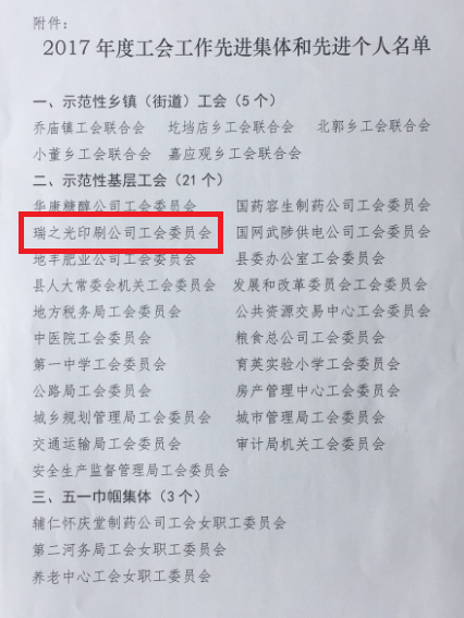 近日,在武陟縣2018年工會工作暨縣“五一”勞動獎表彰大會上,河南瑞之光印刷股份有限公司被武陟縣總工會評為基層工會“規(guī)范化建設(shè)示范點”。