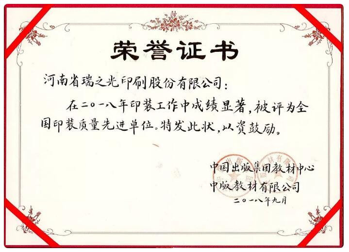 近日,由中國出版集團(tuán)教材中心、中版教材有限公司組織的全國中版教材代印廠質(zhì)量綜合評(píng)比中,河南瑞之光印刷股份有限公司因在2018年印裝工作中成績突出,被評(píng)為全國印裝質(zhì)量先進(jìn)單位。瑞之光印刷將繼續(xù)在印裝質(zhì)量、交貨周期以及綜合服務(wù)上再接再厲,再創(chuàng)佳績。