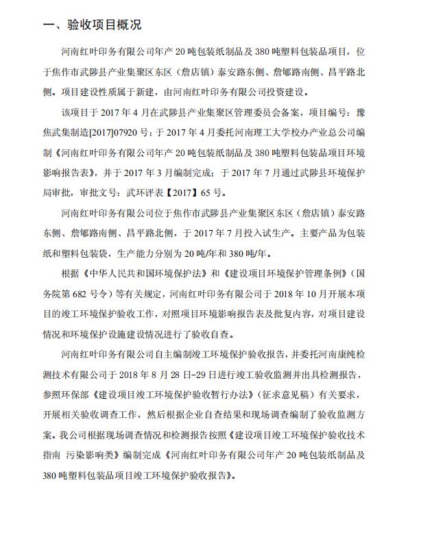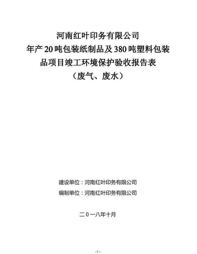 紅葉印務(wù)年產(chǎn)20噸包裝紙制品及380噸塑料包裝品項目竣工環(huán)保驗收報告