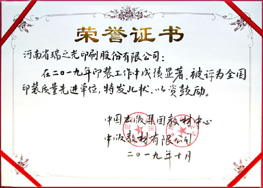 近日,由中國(guó)出版集團(tuán)教材中心、中版教材有限公司組織的全國(guó)中版教材代印廠質(zhì)量綜合評(píng)比中,河南瑞之光印刷股份有限公司在2019年印裝工作中成績(jī)突出,被評(píng)為全國(guó)印裝質(zhì)量先進(jìn)單位。